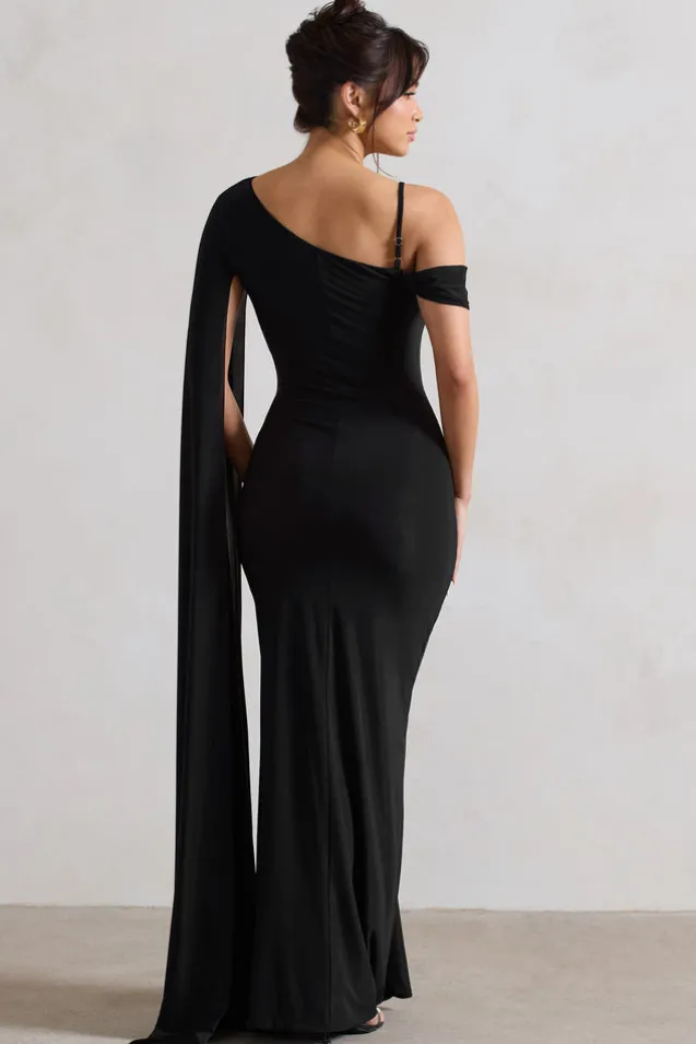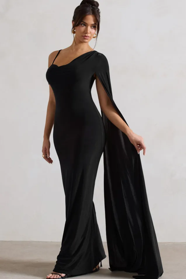 Pedra | Black One Shoulder Cape Sleeve Draped Maxi Dress