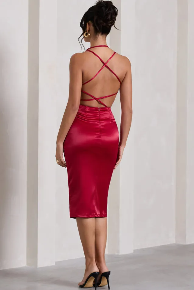 Penelope | Red Satin Twist Front Strappy Midi Dress
