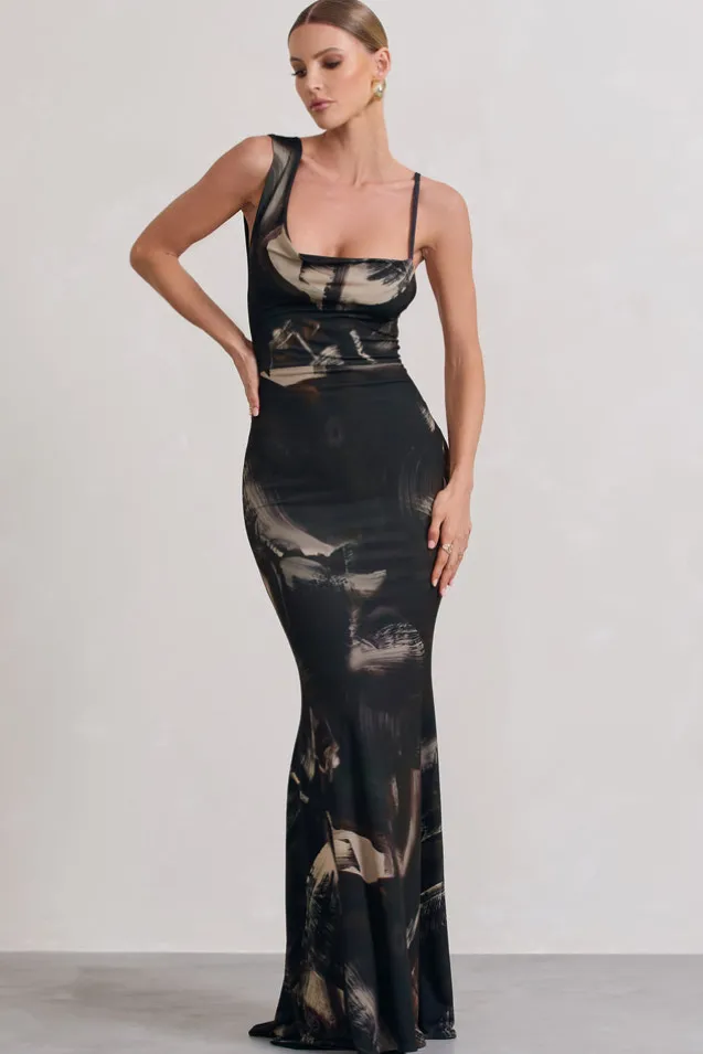 Phantasy | Dark Brown Print Asymmetric Neckline Cowl Maxi Dress