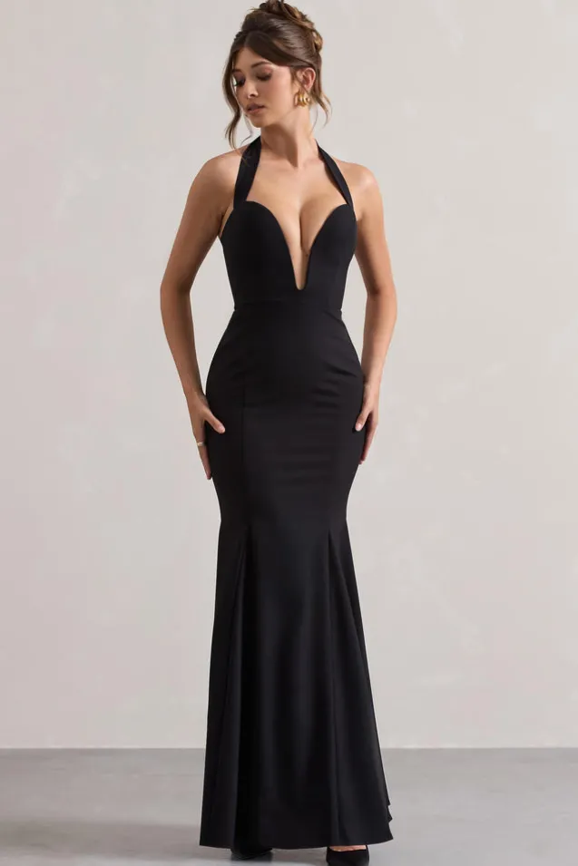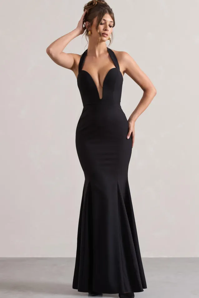 Plaza | Black Plunge Halter-Neck Fishtail Maxi Dress
