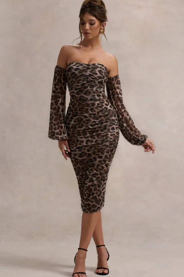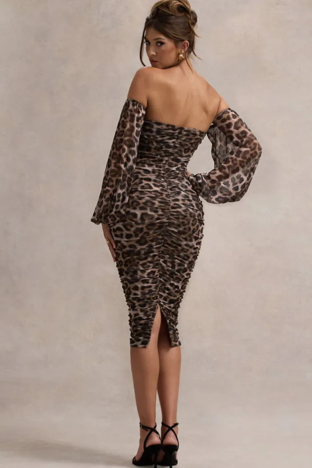 Rica | Leopard Print Bardot Puff-Sleeve Midi Dress