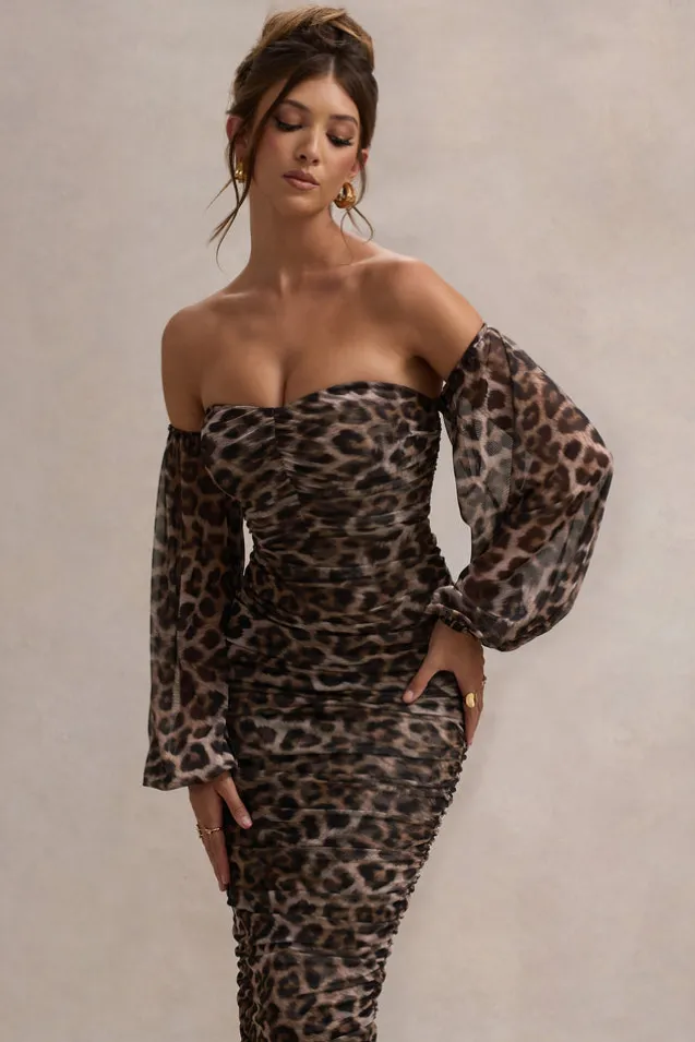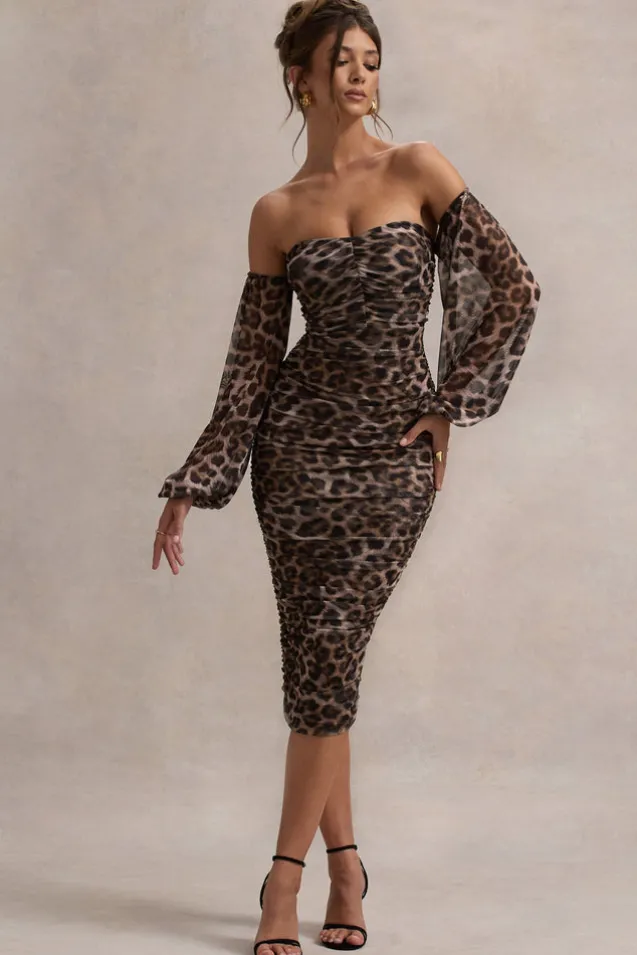 If you’re looking for the wow factor this party season, then look no further than the Rica midi dress. Designed in a bold leopard print of our premium jersey, this figure-skimming piece boasts a fully ruched mesh silhouette, bardot neckline and long sheer sleeves. With so many captivating features, keep Rica at the forefront by teaming yours with some simple gold accents. Features – Premium stretch jersey- Mesh overlay- Fully ruched- Bodycon fit – Bardot neckline – Puff sleeves- Invisible zip closure – Split hemline – Midi length Sizing & Fit Model is 5’7 and wears UK size 8/US size 4 Product Information Designed exclusively by Club L London Double layered with good stretch Premium jersey & mesh in Leopard Print (95% Polyester, 5% Elastane) 115cm total length
