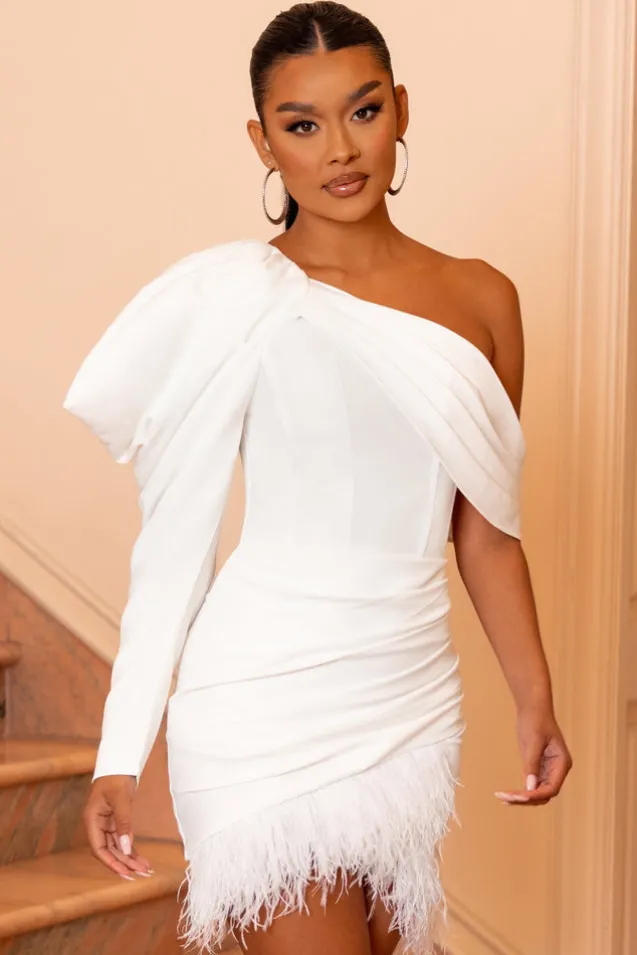 RSVP | Ivory Asymmetric Volume Sleeve Draped Feather Mini Dress