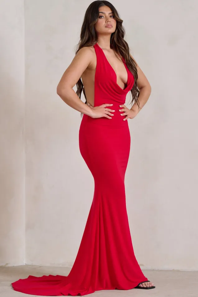 Saffina | Red Cowl Neck Low Back Maxi Dress