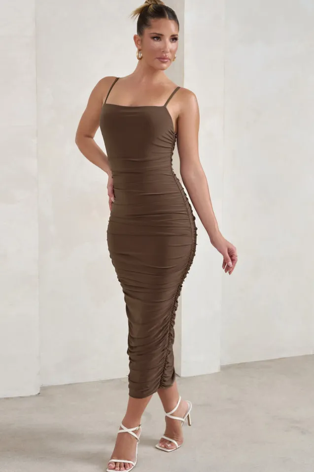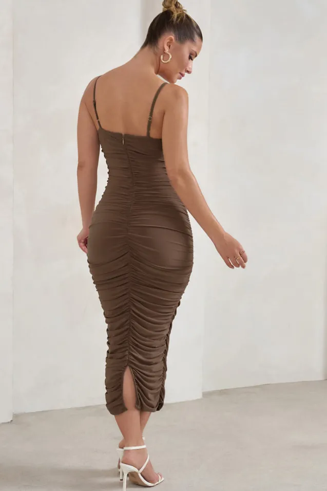 Saffy | Brown Cami Mesh Ruched Midi Dress