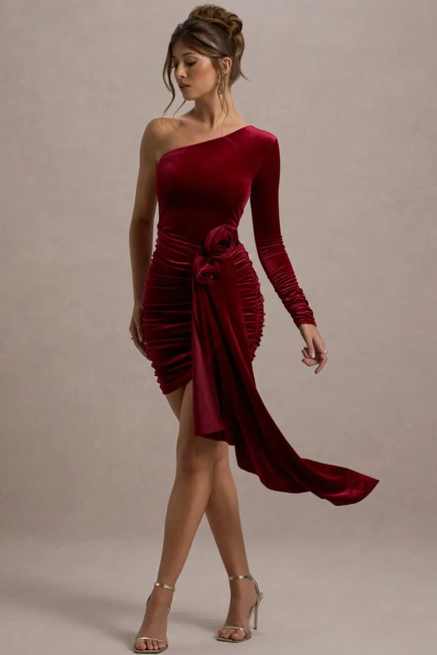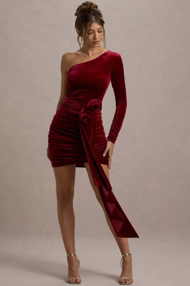 Saint Moritz | Berry Velvet One Sleeve Mini Dress With Flower Drape