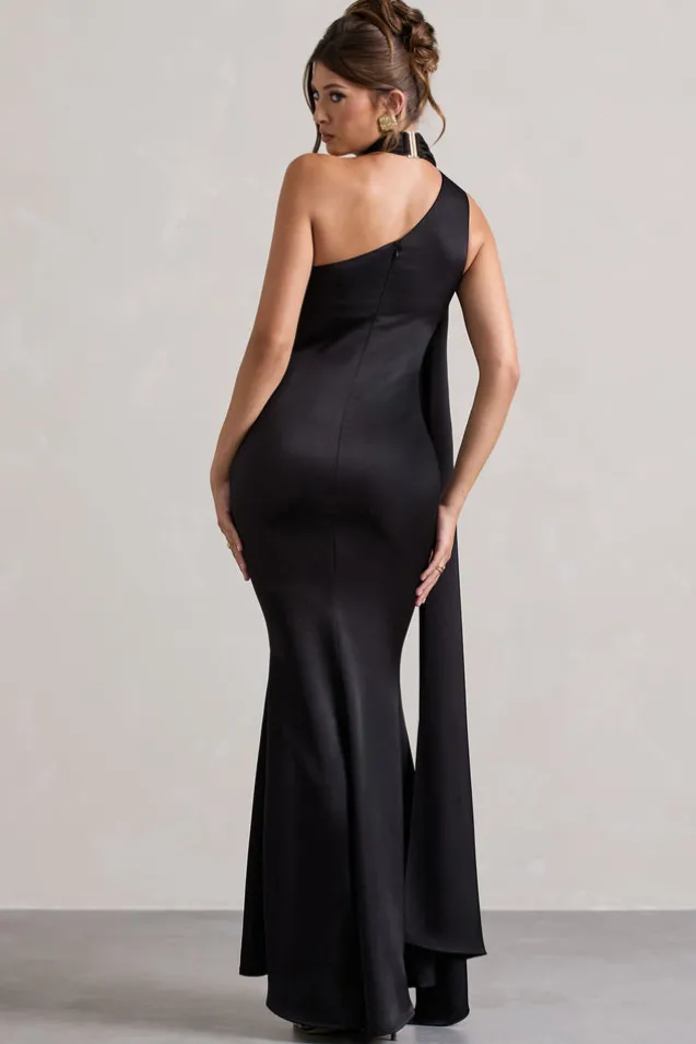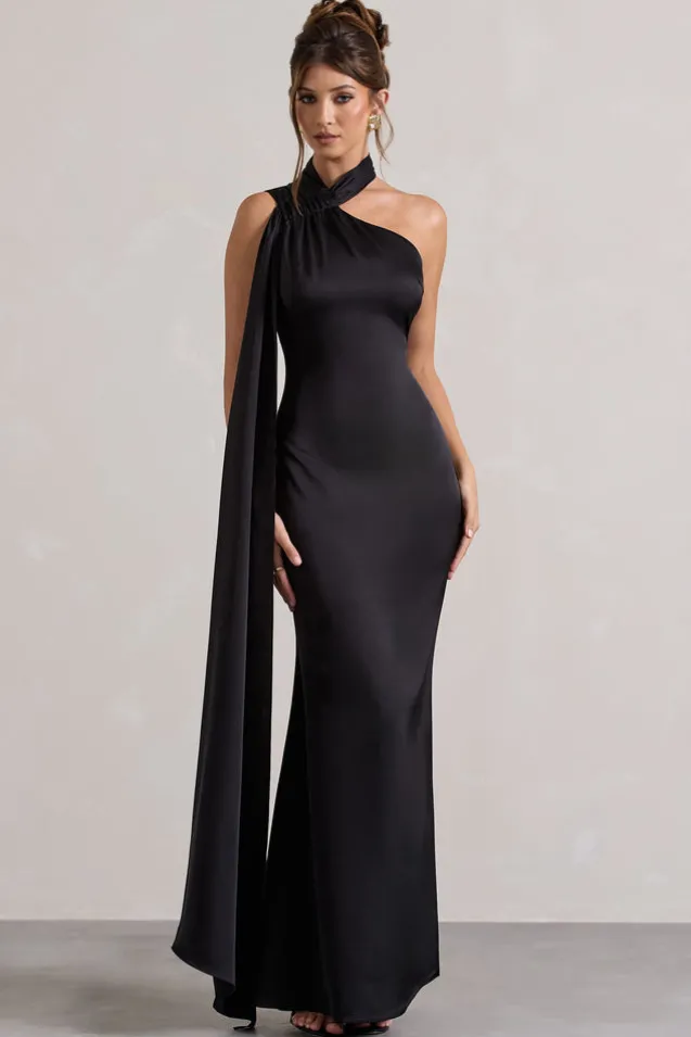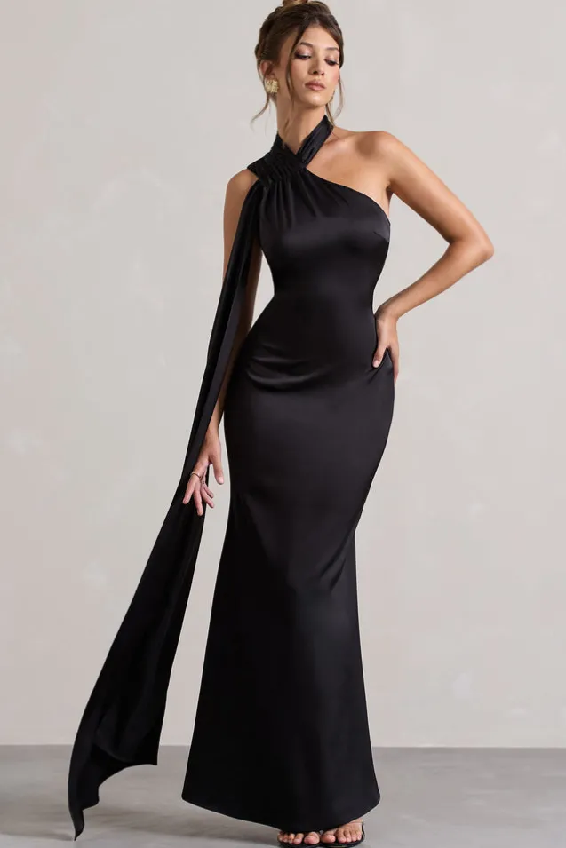 Sancia | Black Satin Asymmetric Maxi Dress With Sash