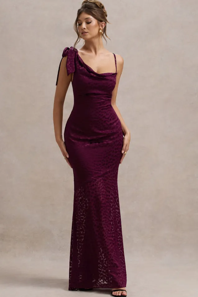 Sangria | Burgundy Satin Jacquard Cowl-Neck Maxi Dress