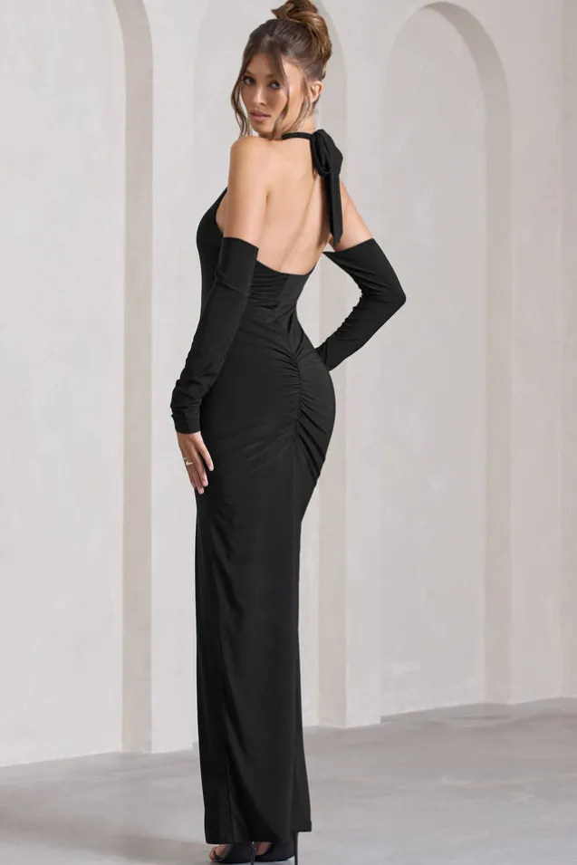 Solana | Black Halter-Neck Long-Sleeve Split Maxi Dress