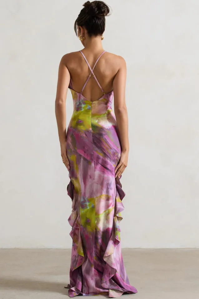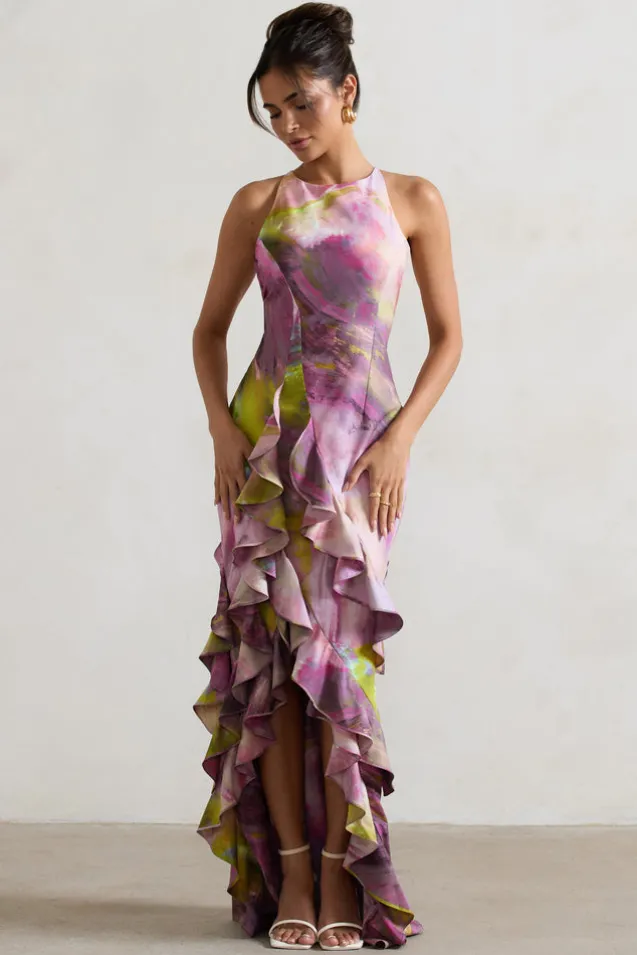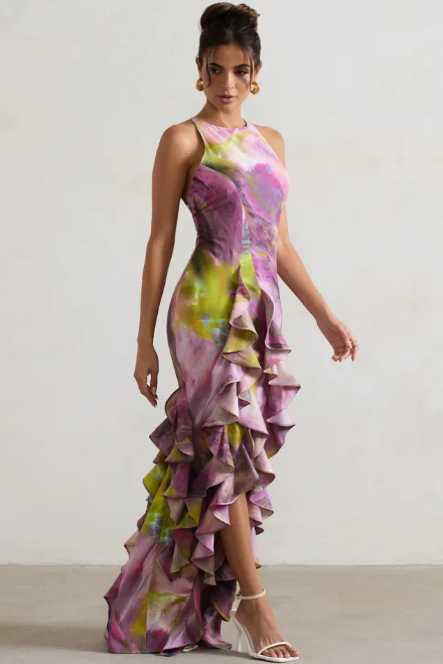 Sommer | Lilac Print Racer-Neck Ruffle Maxi Dress