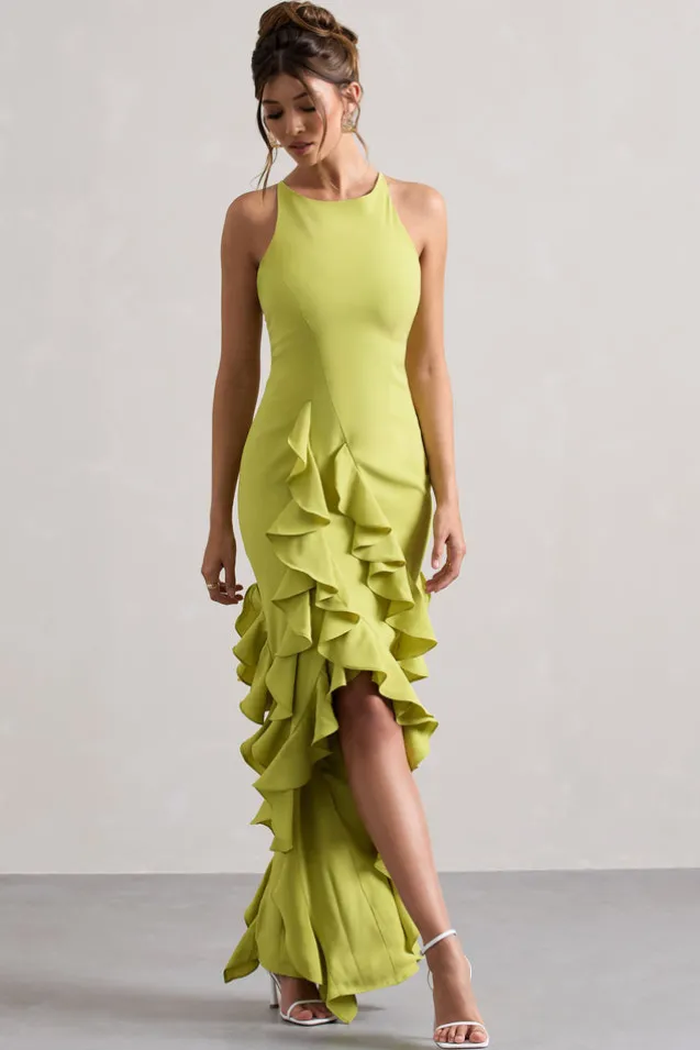 Sommer | Lime Green Racer-Neck Ruffle Maxi Dress