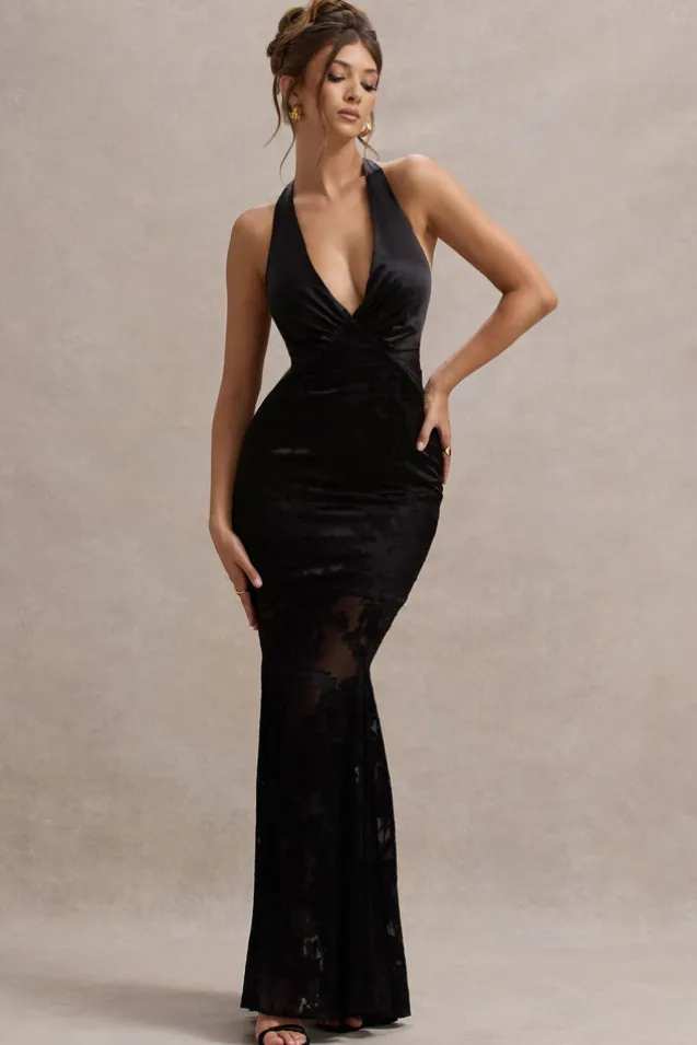Sunset Tales | Black Satin Devore Plunge-Neck Fishtail Maxi Dress