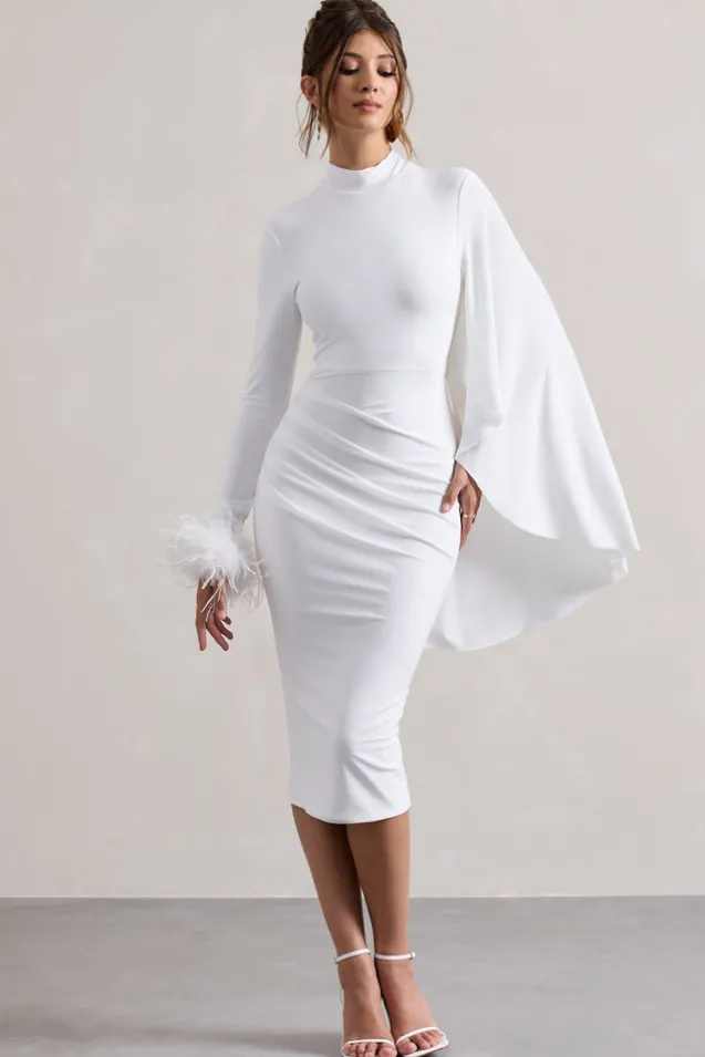 Tamika | White High-Neck Cape-Sleeve Midi Dress With Feathers