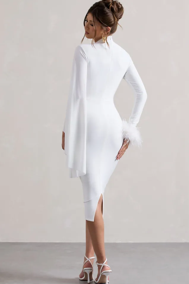 Exude an ethereal mood in Tamika, our heavenly white midi. Designed in our dual-layered jersey, this figure-flattering piece is defined by a turtle neckline, long cape sleeve and luxurious feather finish. For an effortless race day attire, try styling yours with some gold accents and strappy stilettos.Features – Premium stretch jersey – Bodycon fit – Turtle neckline – Single cape sleeve- Detachable feather cuff – Invisible zip closure – Split hemline – Midi length Sizing & Fit Model is 5’7 and wears UK size 8/US size 4Product Information Designed exclusively by Club L London Double layered with good stretch Premium jersey in White (95% Polyester, 5% Elastane)Trim (100% real feathers)120cm total length
