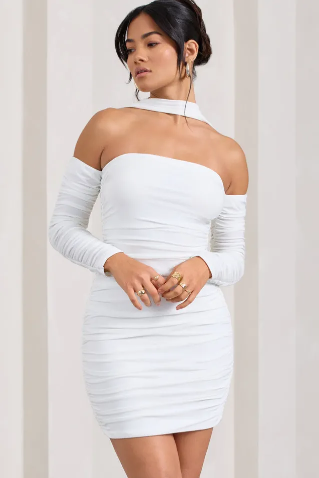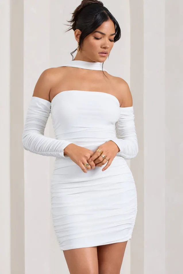 Thea | White Ruched Long-Sleeved Bodycon Mini Dress With Halter Collar