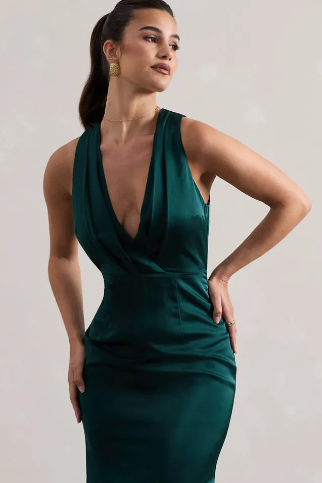 Tiffany | Bottle Green Satin Plunge-Neck Maxi Dress