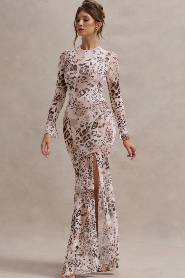 Tigerlily | Leopard Print Mesh Long-Sleeve Open-Back Maxi Dress
