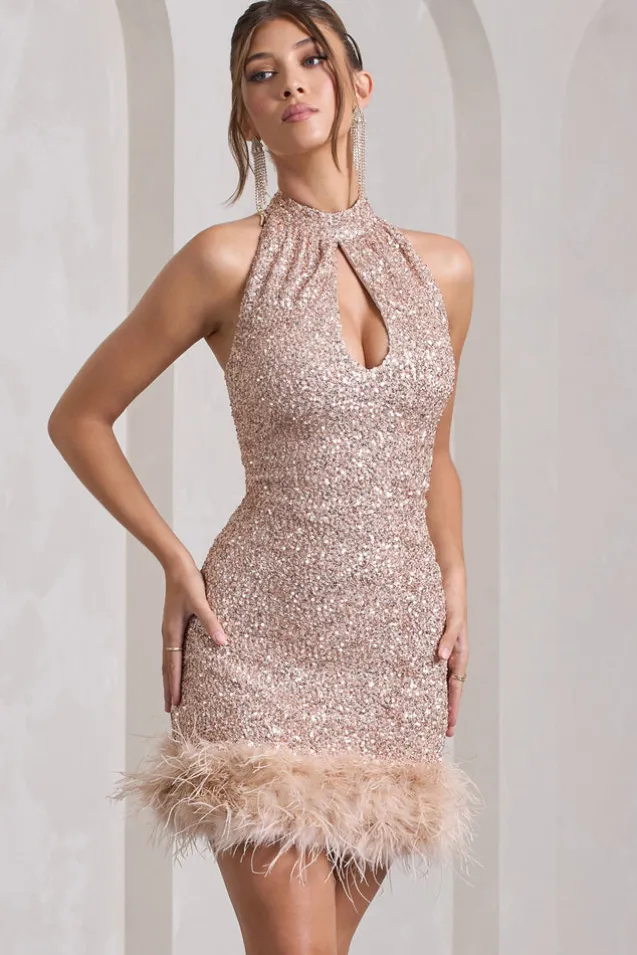 Opt for a high impact look this season in Tillie, our latest sparkly mini dress. Showered in champagne sequins then wrapped in feathers, this sleeveless dress features a high halter neckline that buttons from behind and a keyhole cut-out at the front. Pair Tillie with classic gold hoops and you’ll surely shine in any party setting.Features- Premium sequin fabric- Halter neckline- Cut-out detailing- Button-closed collar- Feather trim- Mini lengthSizing & FitModel is 5’9″ and wears UK size 8/US size 4Product InformationDesigned exclusively at Club L LondonLined with good stretchPremium sequin fabric in Champagne (100% PET, 95% Polyester, 5% Elastane)Trim: 100% real feathers85cm total length