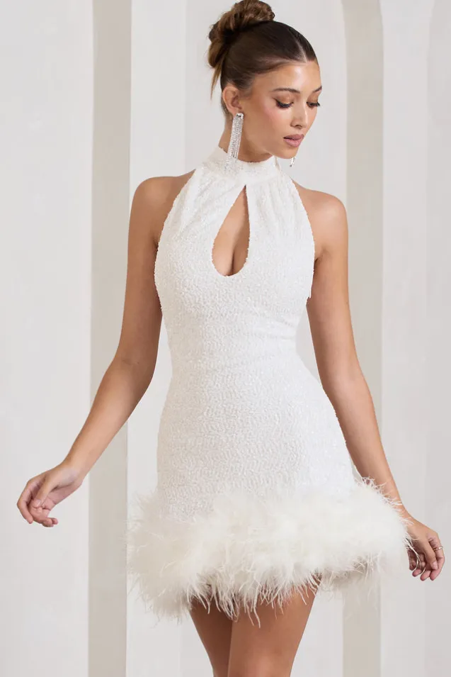 Opt for a high impact look this season in Tillie, our latest sparkly mini dress. Showered in white sequins then wrapped in feathers, this sleeveless dress features a high halter neckline that buttons from behind and a keyhole cut-out at the front. Pair Tillie with classic gold hoops and you’ll surely shine in any party setting.Features- Premium sequin fabric- Halter neckline- Cut-out detailing- Button-closed collar- Feather trim- Mini lengthSizing & FitModel is 5’7″ and wears UK size 8/US size 4Product InformationDesigned exclusively at Club L LondonLined with good stretchPremium sequin fabric in White (100% PET, 95% Polyester, 5% Elastane)Trim: 100% real feathers85cm total length