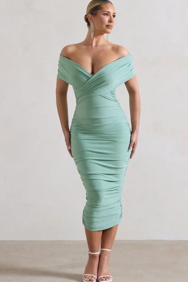 Unwrapped | Sage Ruched Twist Bardot Midi Dress