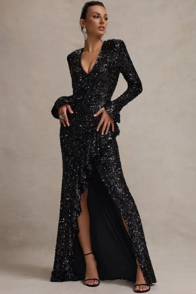 Wild Dream | Black Sequin Plunge-Neck Ruffle Split Maxi Dress