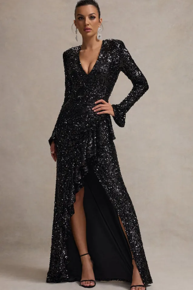 Made to step into the spotlight, party season calls for a dress like Wild Dream. Designed in a sea of sparkling black sequins, this maxi dress features a plunge neckline, long sleeves and ruffled wrap skirt. Let Wild Dream do the talking at your next event and style yours with some simple strappy stilettos.Features – Premium sequin- Plunge neckline – Long sleeves- Invisible zip closure – Flared cuffs- Ruffle trim- Wrap skirt- Maxi length Sizing & Fit Model is 5’7 and wears UK size 8/US size 4 Product Information Designed exclusively by Club L London Partially lined with some stretch Premium sequin in Black (95% Polyester, 5% Elastane)Premium slinky lining (97% Polyester, 3% Elastane)155cm total length